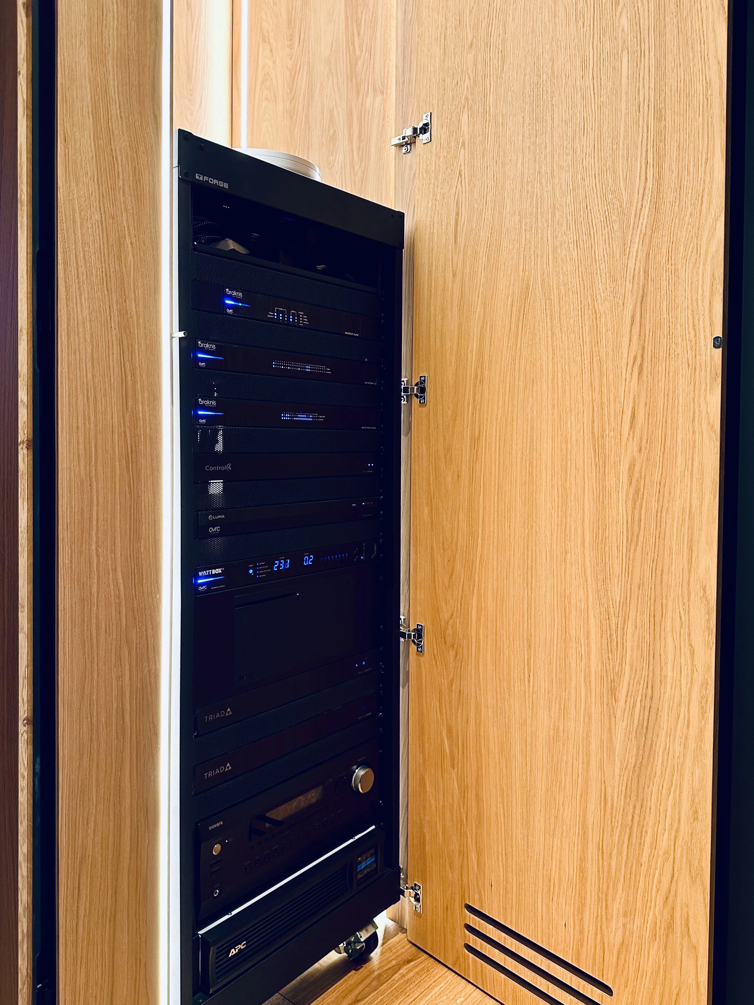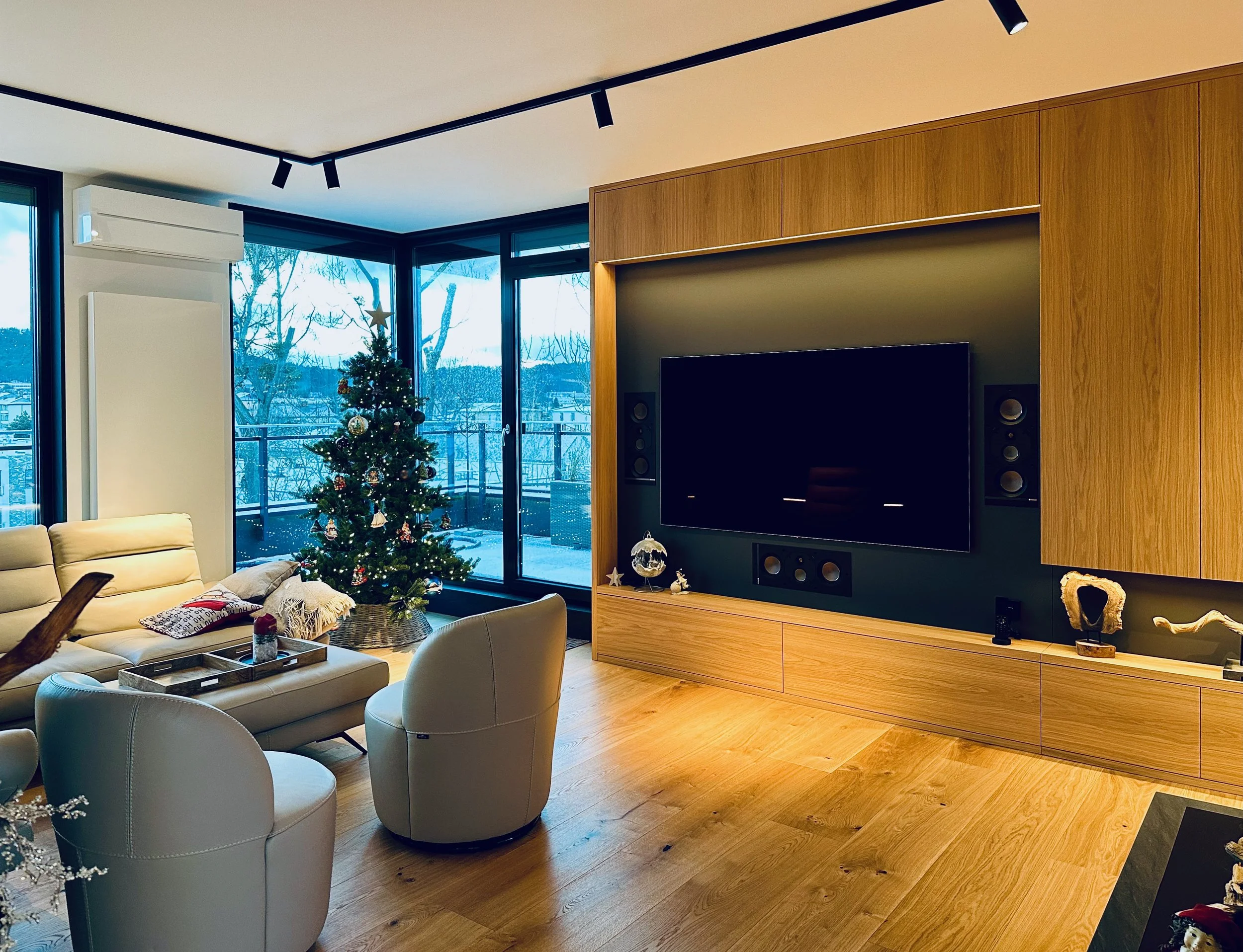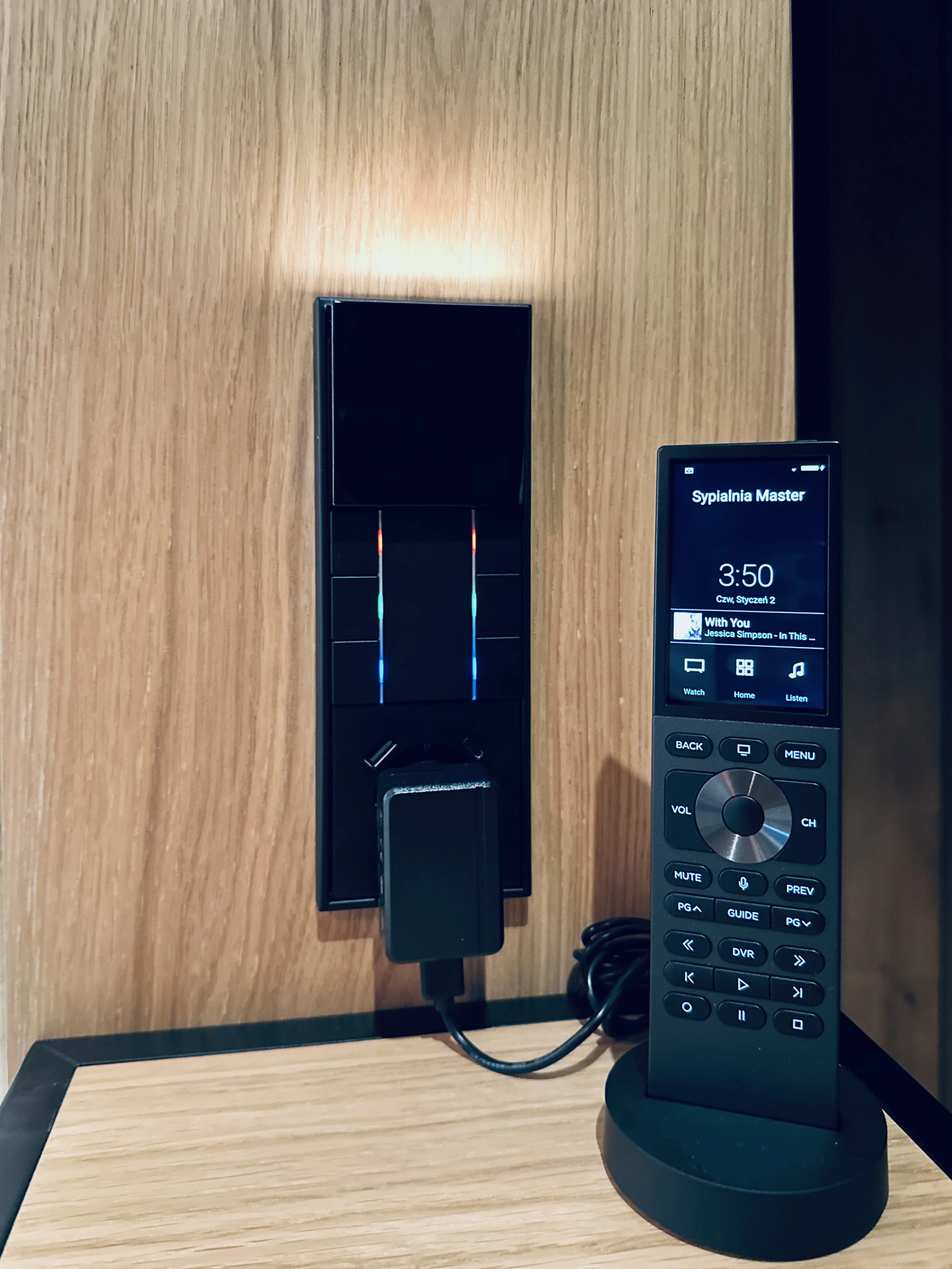 Apartament o powierzchni 115 m² w Rumi został zaprojektowany jako w pełni zintegrowana przestrzeń smart home, łącząca komfort, automatyzację oraz intuicyjne doświadczenie użytkownika. System obejmuje 7 niezależnych stref audio (w tym taras), około 50 obwodów oświetleniowych oraz pełne sterowanie oświetleniem, roletami, HVAC i systemem AV za pośrednictwem Control4. Instalacja została również zintegrowana z systemem alarmowym, zapewniając użytkownikowi jeden przejrzysty interfejs do zarządzania wszystkimi funkcjami budynku. Kluczowym elementem tej realizacji jest zaawansowana automatyka oparta na czujnikach obecności Steinel, które dynamicznie zarządzają scenami oświetleniowymi. Dzięki temu użytkownik rzadko musi korzystać z tradycyjnych włączników, ponieważ apartament inteligentnie dostosowuje się do codziennych aktywności i obecności domowników.