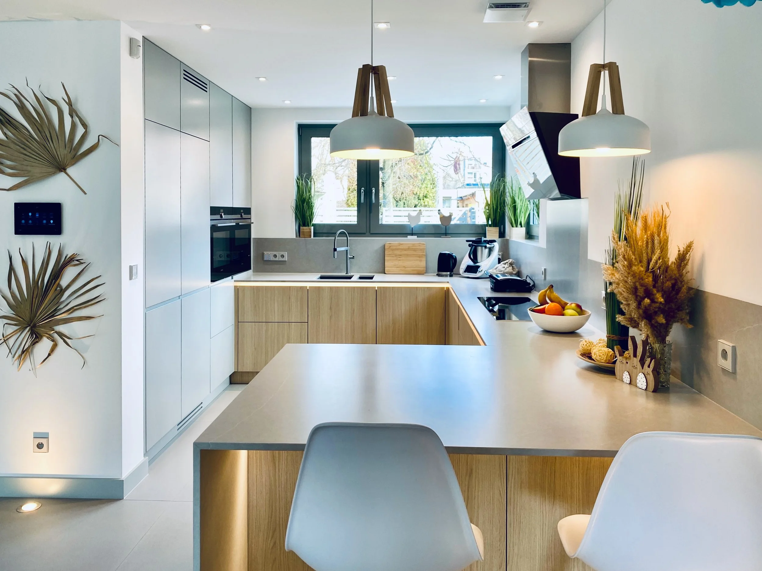 Wszystkie instalacje – od oświetlenia i rolet, po klimatyzację, wentylację, okna dachowe Velux, telewizory, multiroom audio i bramy garażowe – współpracują jako jeden zintegrowany system dopasowany do codziennych potrzeb.